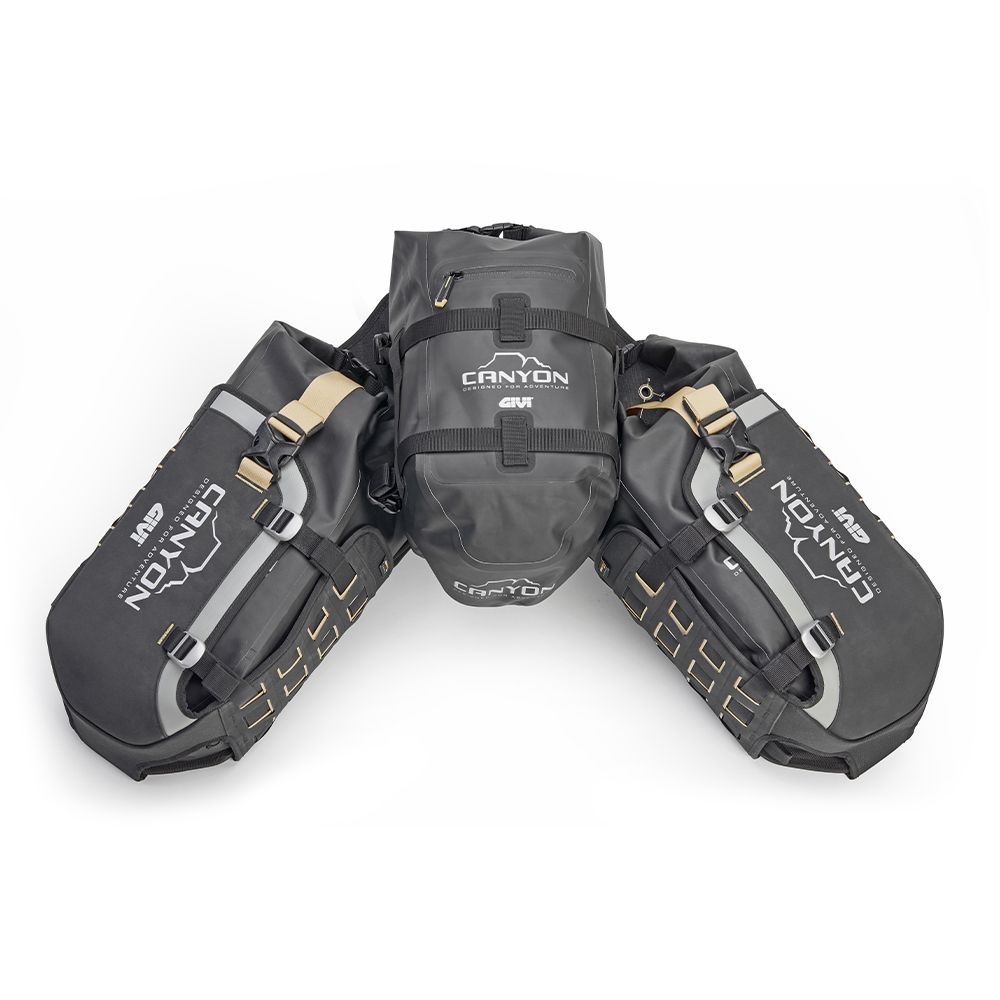 Lateralmente sono disposte due borse laterali waterproof da 16 litri, ed una borsa centrale, sempre impermeabile, da 12 litri, offrendo una capacità di carico complessiva di 44 litri. Grazie al sistema M.O.L.L.E. presente su tutte le borse della gamma, è inoltre possibile aumentare ulteriormente il carico aggiungendo ad esempio la borsa GRT730 che può contenere attrezzi o due borracce. In questo modo è possibile adattare al meglio la configurazione della moto in base alle proprie esigenze di viaggio, da brevi itinerari off road, a grandi avventure in giro per il mondo.