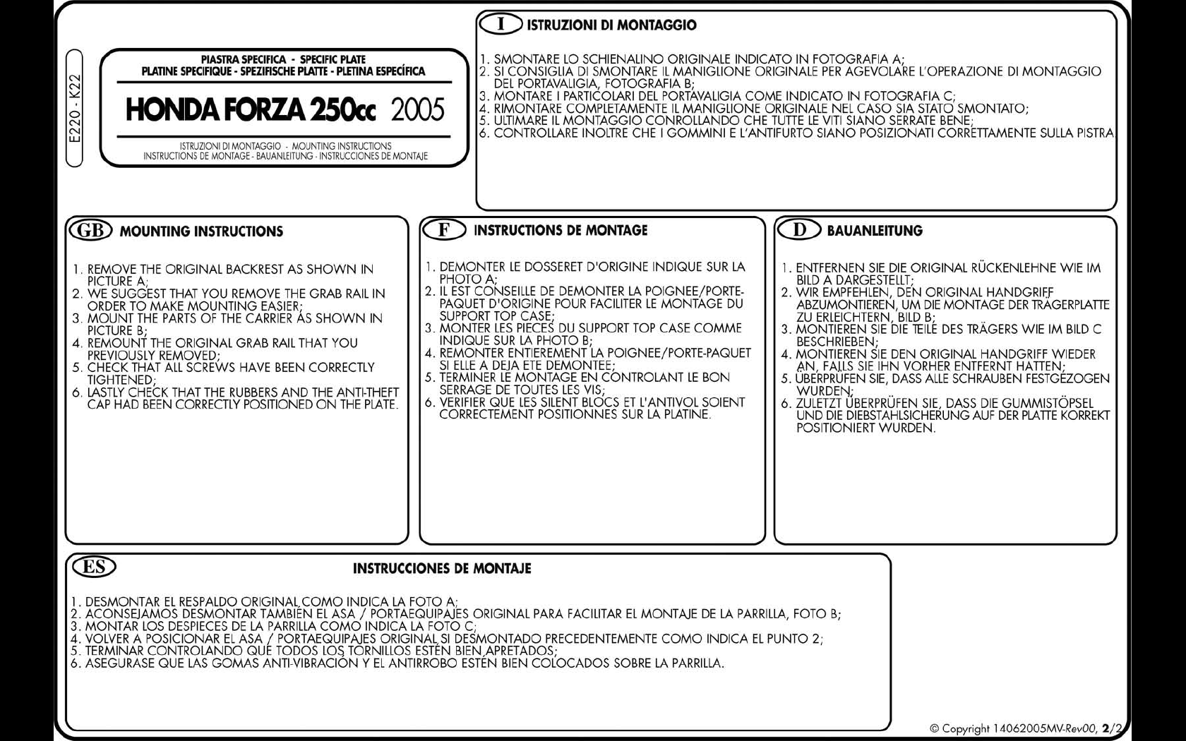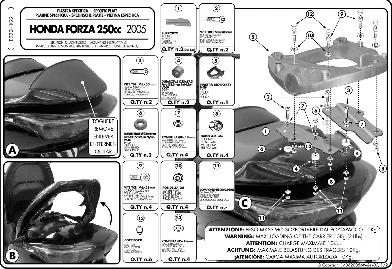 Attacco posteriore Givi E220 per Honda Forza 250 05-07, specifico per bauletto Monokey, comprensivo di staffa Monokey