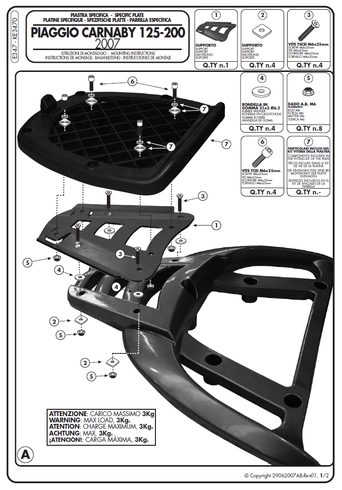 Attacco posteriore Givi E347 MONOLOCK per Piaggio Carnaby 125-200 2007-2008, specifico per bauletto Monolock