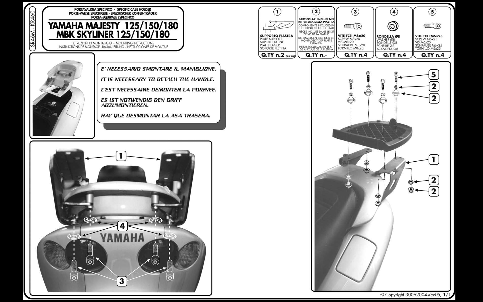 Attacco posteriore Givi SR46M per MBK Skyliner 125-150 01-13 e Yamaha YP Majesty 125-150-180 01-11, specifico per bauletto Monolock, comprensivo di piastra Monolock