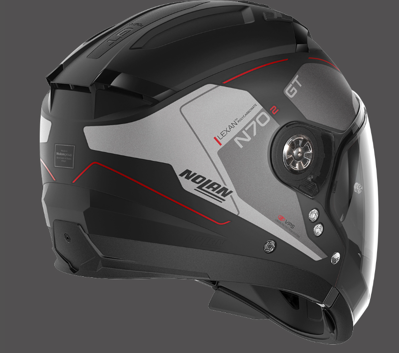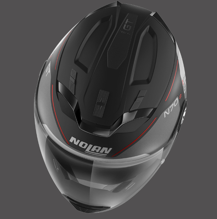 È il nuovo crossover da strada top di gamma di Nolan che conferma ed arricchisce le già apprezzate e consolidate caratteristiche tecniche del predecessore N44. Si caratterizza per il design inconfondibile, le ricche dotazioni tecniche e la buona disponibilità di colori e grafiche. Volume contenuto (grazie alla disponibilità di due misure di calotta esterna), doppia omologazione P/J, visiera ultrawide, schermo parasole VPS (regolabile in svariate posizioni e dotato di sistema di richiamo automatico), sistema di ventilazione superiore AirBooster Technology, sistema di ritenzione con regolazione micrometrica a doppia leva Microlock2, innovativa imbottitura interna di conforto Clima Comfort (con tessuti micro- forati e paranuca regolabile) e predisposizione per il sistema di comunicazione N-Com vogliono fare di N70-2 GT il crossover da strada di riferimento per il moto-turista più esigente