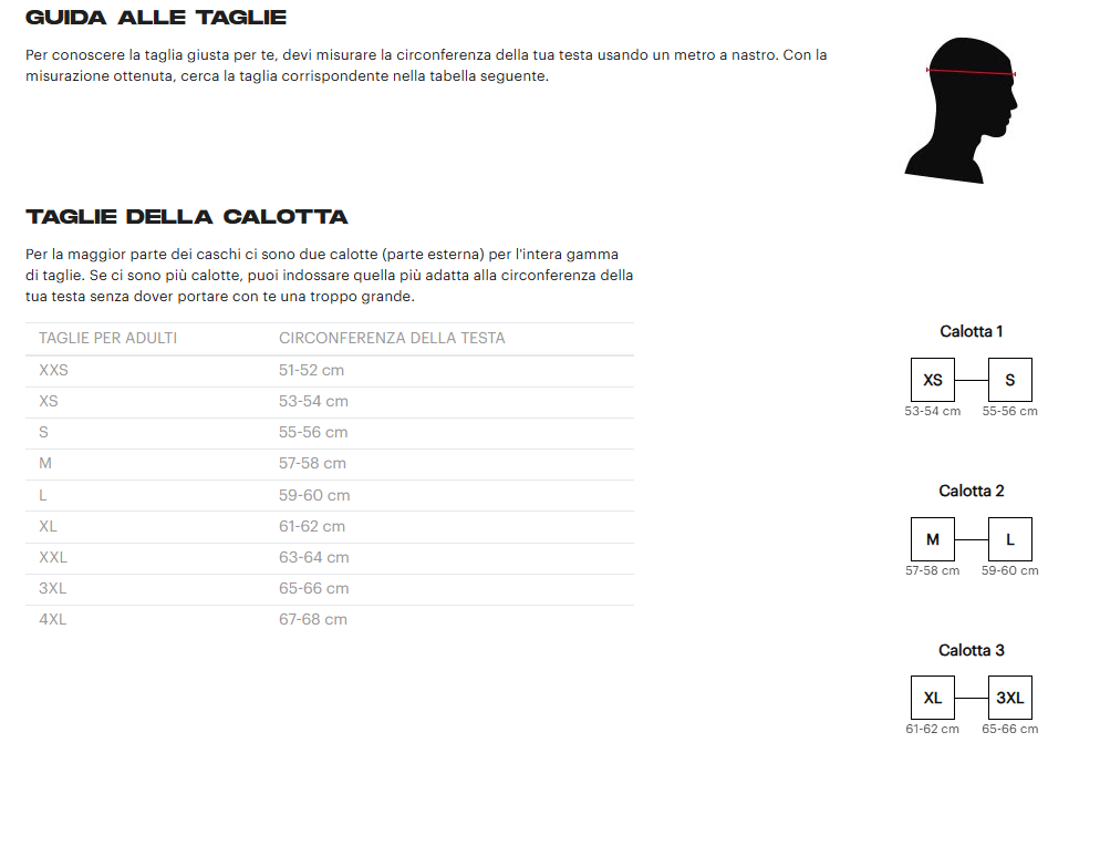 - Il casco è prodotto con 2 calotte di diversa misura a seconda della taglia proposta e permette così di offrire una perfetta proporzione tra il volume del casco e la taglia del motociclista, mantenendo inalterato il grado di protezione e sicurezza.