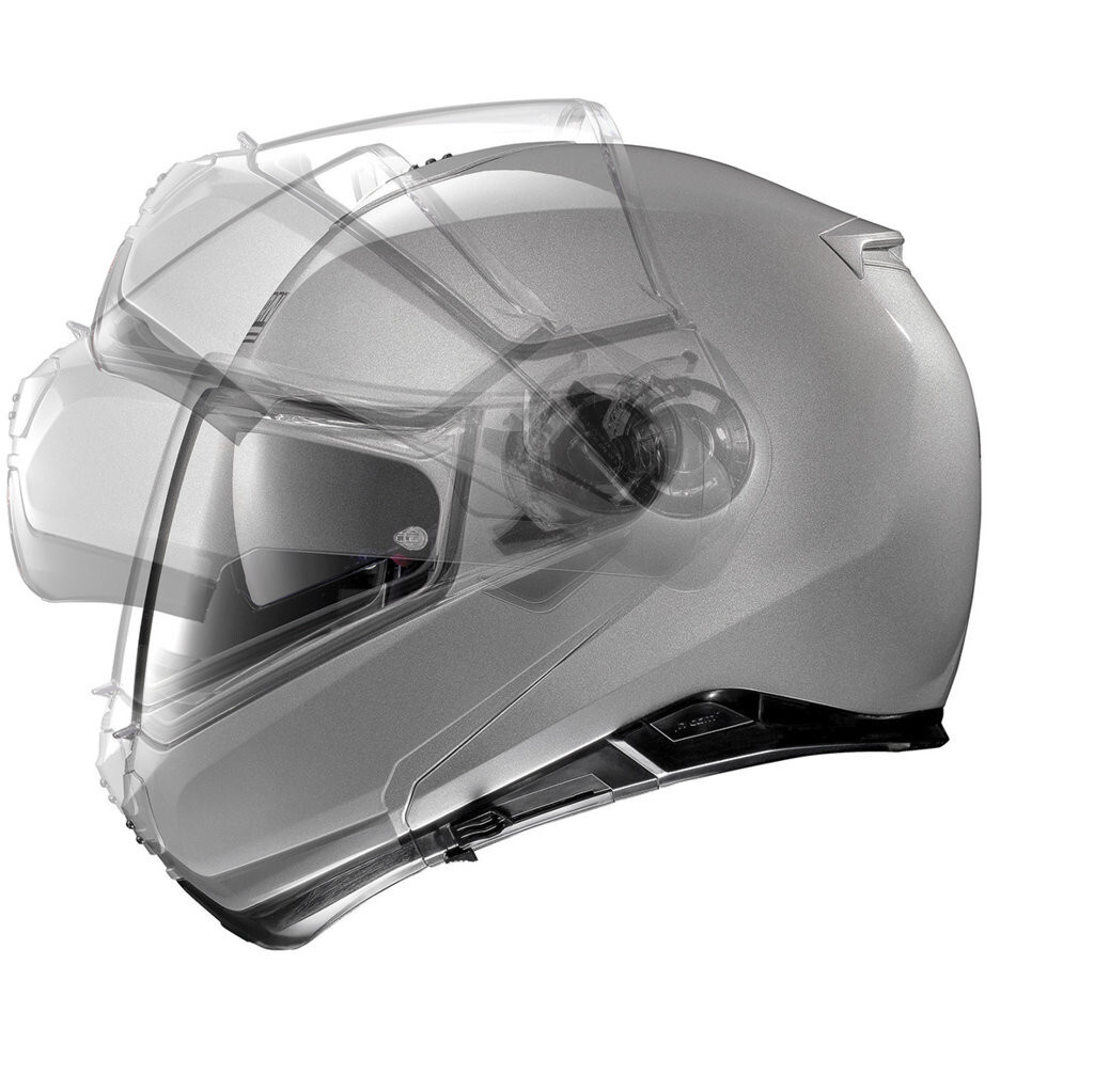 Posizionato all’interno del casco, è stampato in LEXANTM* e prevede trattamento S/R (Scratch Resistant – resistente al graffio) e F/R (Fog Resistant – resistente all’appannamento). Offre protezione UV sino a 400 nanometri e può essere facilmente smontato, quando non necessario oppure per manutenzione e pulizia.Il sistema di azionamento (brevettato) consente il richiamo automatico dello schermo parasole in posizione di non utilizzo. In tal modo, risultano semplificate le eventuali manovre di emergenza derivanti dalla necessità di ripristinare rapidamente la massima visibilità offerta dalla visiera, come ad esempio accade quando si entra in un tunnel. * LEXANTM E’ UN MARCHIO REGISTRATO DI SABIC