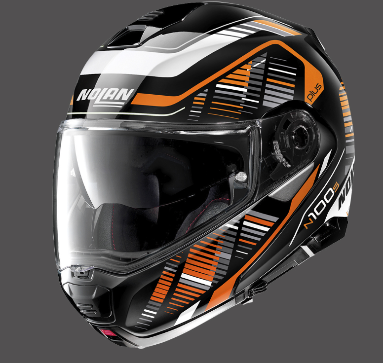 È la nuova e più esclusiva versione dell’apribile top di gamma di Nolan, ora arricchito dell’imbottitura interna di conforto Clima Comfort con innovativa costruzione a rete e del sistema di regolazione della posizione della cuffia (LPC Liner Positioning Control). I nuovi contenuti tecnici trovano riscontro in una vestizione grafica sportiva ed elegante e nella completa revisione stilistica dell’imbottitura interna di conforto. Sono poi confermate le consolidate caratteristiche tecniche che fanno di N100-5 un prodotto apprezzatissimo dai moto turisti più esigenti: volume contenuto (grazie alla disponibilità di due misure di calotta esterna), doppia omologazione P/J, visiera ultrawide, schermo parasole VPS (regolabile in svariate posizioni e dotato di sistema di richiamo automatico), sistema di ventilazione superiore AirBooster Technology, movimento di rotazione della mentoniera con traiettoria ellittica, esclusivo sistema di apertura della mentoniera con meccanismo a doppia azione, sistema di ritenzione con regolazione micrometrica a doppia leva Microlock2, imbottitura interna di conforto Clima Comfort (con tessuti micro forati e paranuca regolabile) e predisposizione per il sistema di comunicazione N-Com.