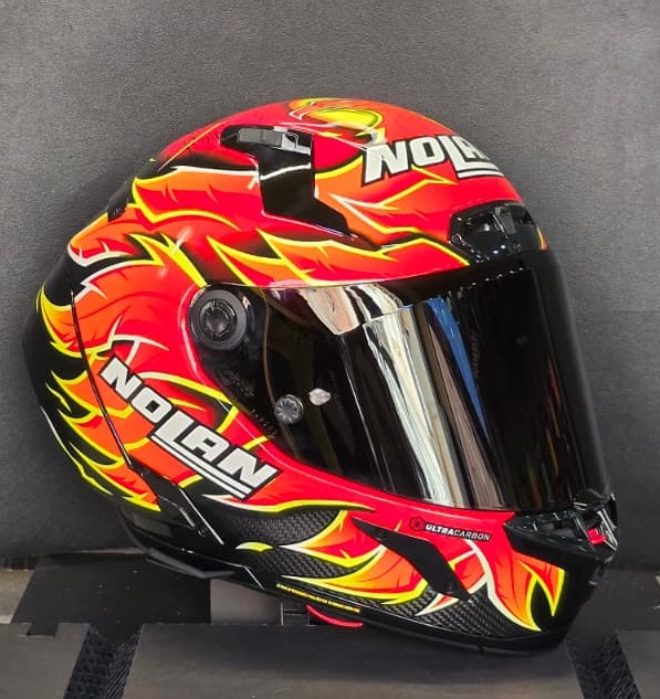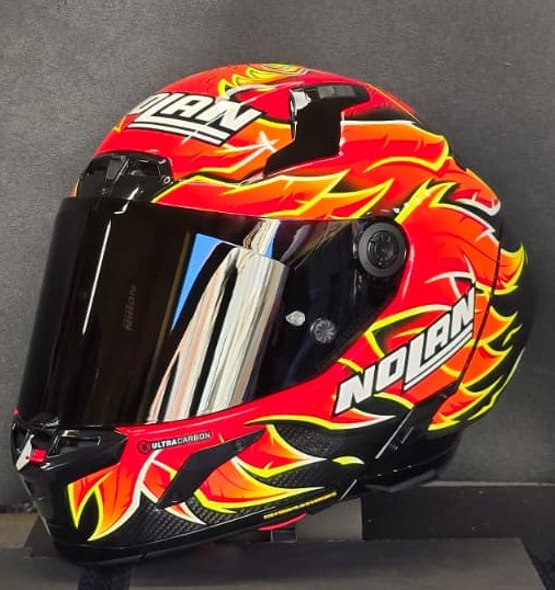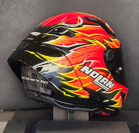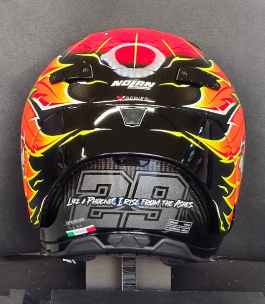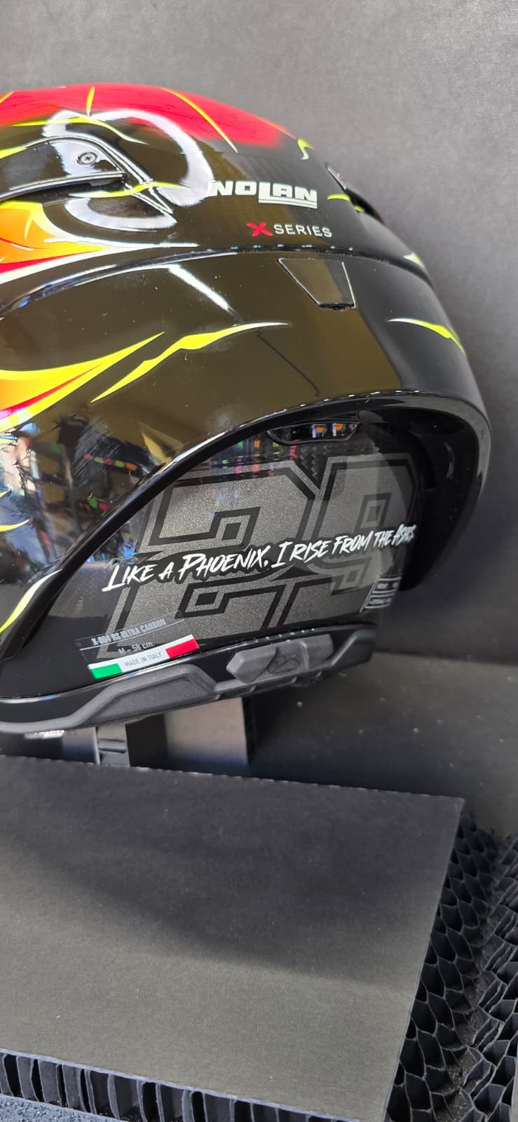 L’unione tra un Brand capace di coniugare stile e sportività quale è Nolan e un pilota coriaceo, dal carattere forte e combattivo come Andrea Iannone, ha dato vita a questo casco unico: X-804 RS UC REPLICA IANNONE. Ogni linea grafica presente sulla calotta è simbolo di una trasformazione profonda, che riflette il presente di Andrea, costruito con ambizione e dedizione. Un chiaro messaggio che si cela dietro all’immagine della fenice unita alla frase “LIKE A PHOENIX I RISE FROM THE ASHES”: un invito a non fermarsi mai, continuando ad alimentarsi in ogni istante con il fuoco che brucia dentro ad ognuno di noi. Fibra e carattere sono i due punti cardine di questa versione, molto simile all’originale indossato dal pilota in gara, realizzata sulla base del top di gamma integrale in fibra Speeding, personalizzato con dettagli grafici esclusivi: la grafica applicata, con i colori rosso, arancio, giallo e bianco cangianti, si alterna sulla calotta a parti di fibra di carbonio nero pure a vista e a parti lucide, dando al casco una personalità ancora più grintosa e sportiva. Il rosso che avvolge la fenice, si allarga su tutto la parte superiore della calotta, estendendosi fino all’attacco dello spoiler dove la grafica prosegue fino all’estremo retro del casco, riprendendo il logo Nolan e la scritta XSeries, a identificare i caschi in fibra della collezione. Infine, il numero di gara 29 di Iannone è riportato sulla calotta lucida posteriore (sotto allo spoiler), dove è evidenziata anche la scritta “LIKE A PHOENIX I RISE FROM THE ASHES”. Completano il casco REPLICA le prese d’aria lucide. X-804 RS UC è rivolto ai piloti che pretendono il massimo in termini di prestazioni, tecnologia e presenza per distinguersi anche in pista, con un casco che rappresenta l’essenza dello sport reinterpretata in stile Nolan.