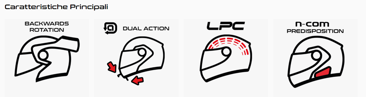 Dual Action – Sistema di apertura della mentoniera: Scopri la praticità del sistema di apertura della mentoniera Dual Action, una tecnologia che garantisce un movimento di apertura e chiusura della mentoniera estremamente fluido, adattandosi alle tue esigenze di guida con precisione e semplicità.