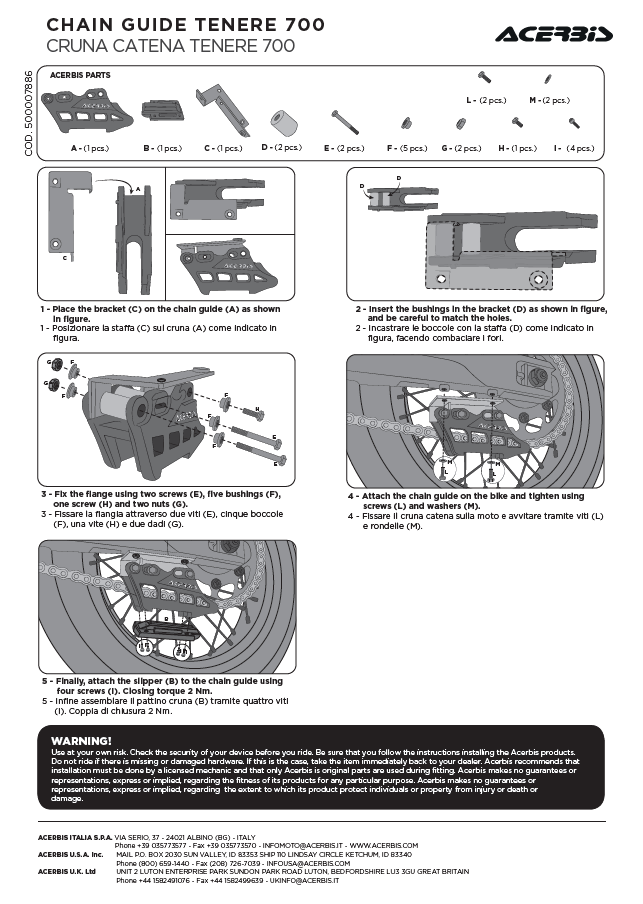 All’interno del kit troverete la minuteria necessaria per il fissaggio e la piastrina a forma di ” L ” per poter fissare la cruna ACERBIS al forcellone della motocicletta.