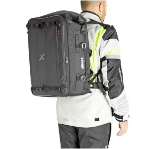 •Tasca posteriore con doppia zip: la zip superiore contiene un’imbottitura, da utilizzare come schienalino passeggero. La zip inferiore contiene la copertina antipioggia in materiale giallo fluorescente