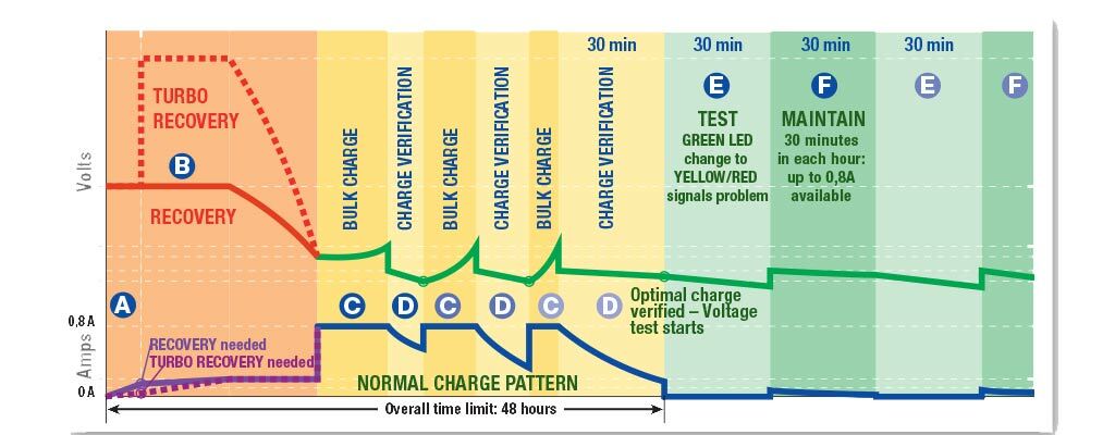 - RECUPERO: Accensione a bassa tensione a 0,5 V + recupero desolfatazione a 2 fasi* (*recupero dell’impulso a bassa tensione monofase durante la modalità CAN-bus).