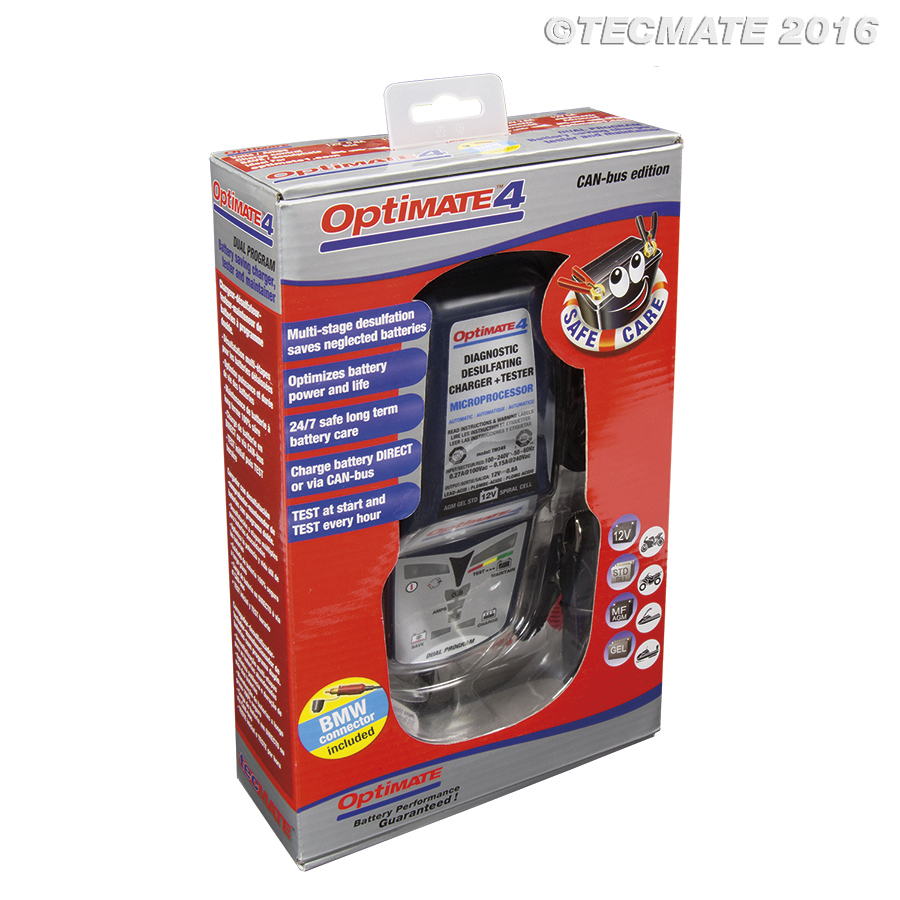 OptiMate 4 Dual Program, versione CAN-bus, include due programmi di carica; il programma 1 è per la carica normale diretta di una batteria, il programma 2 consente una carica sicura e senza sorveglianza attraverso una presa da 12 V controllata dal bus CAN di una moto BMW.