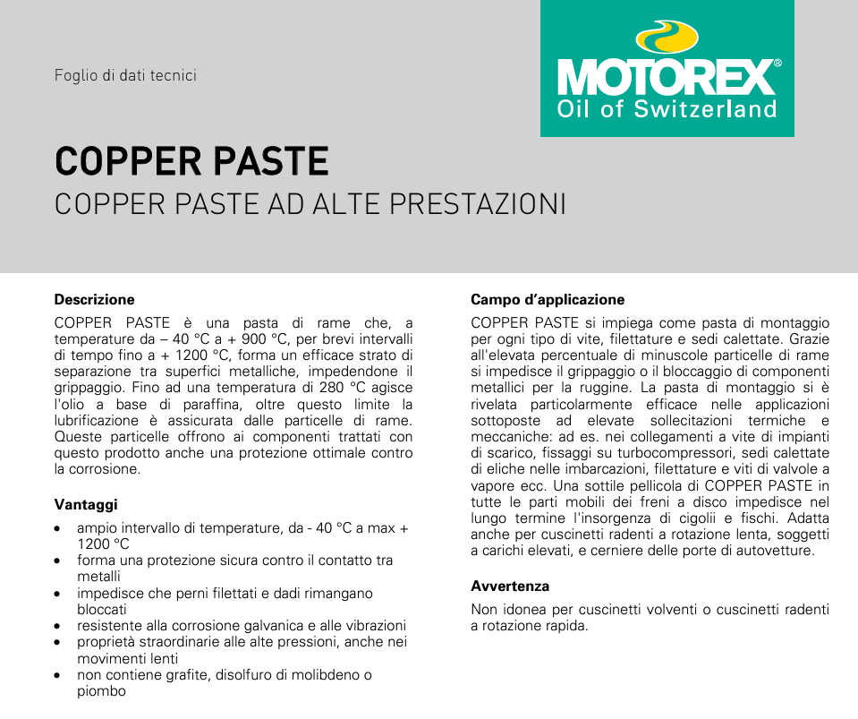 MOTOREX COPPER PASTE è una pasta al rame che, a temperature da – 40 °C a + 900 °C, per brevi intervalli di tempo fino a + 1200 °C, forma un efficace strato di separazione tra superfici metalliche impedendone il grippaggio. si impiega come pasta di montaggio per ogni tipo di vite, filettature e sedi calettate.