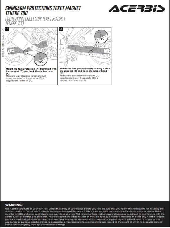 - Fissaggio tramite magneti ed elastici, che permette in pochi secondi una rapida rimozione delle protezioni dal forcellone, ogni qual volta si voglia provvedere al lavaggio e/o alla manutenzione del forcellone stesso.