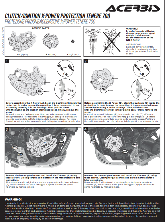 Protezioni motore specifiche, proteggono dall’usura di stivali, urti, sporco, fango e altri detriti. Facile da installare utilizzando i bulloni originali del carter e del coperchio dell’accensione/frizione. Resistente alle alte temperature, progettato per non interferire con gli stivali.